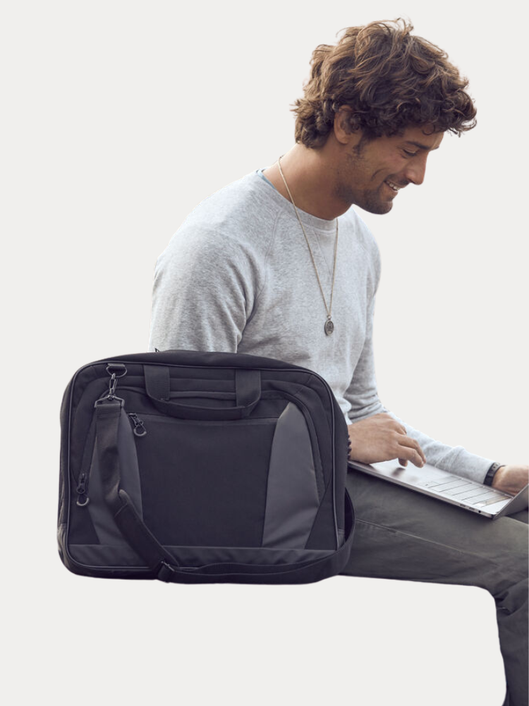 Zakelijke laptoptas met professionele uitstraling. De tas is voorzien van meerdere zakken en compartimenten inclusief een gewatteerd compartiment voor het veilig opbergen van een laptop. De tas is afgewerkt met een schouderband met ruimte voor het opbergen van een visitekaartje. De tas is gemakkelijk te bevestigen aan bijvoorbeeld een rolkoffer. Afmeting en volume: 40x32x11cm ≈ 14L