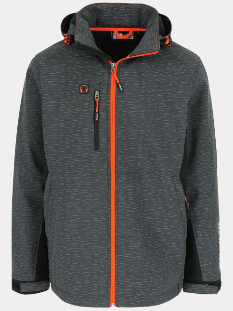 • Multi-pocket ademende, waterafstotende en winddichte 3-laags softshell jas met uitneembare kap en reflecterende all-over print